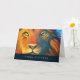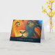 Eine Geburtstagskarte mit einem Ölgemälde von einem nahen Löwengesicht mit üppiger Mane und durchdringenden gelben Augen. Die dominierenden Farben sind orange und gelb. Geburtstagsnachricht drinnen, die Sie anpassen oder verlassen können, wie es ist.