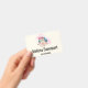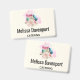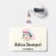 Ein Namensschild mit einem schönen Bild. 3 farbenfrohe Macarons, rosa, grün und blau, mit einem Blumenstrauß aus extravaganter Rose und einem Pink-Aquarell. Auch köstlich und stilvoll! Hellgelber Hintergrund.