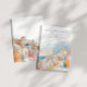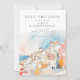 Eine farbenfrohe und moderne mediterrane Hochzeit Save the Date mit einer schönen Aquarelllandschaft in Rosa, Blau und Orange sowohl vorne als auch hinten.
