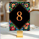 Mit dieser farbenfrohen Hochzeitsfeier in Mexiko-Tischnummer mit lebhaften Blumenmustern und traditionell fiesta-inspirierten Motiven fügen Sie Ihrem Flair einen besonderen Schuss hinzu. Helle Farbtöne in Rot, Gelb, Türkis und Grün tanzen um lebendige Blüten und erwecken den fröhlichen Geist einer mexikanischen Hochzeit. Die kühne, leicht lesbare Nummerierung wird von folkloristischen Details und lebhaften Designs gerahmt und schafft so einen fröhlichen und eleganten Weg, die Gäste zu ihren Plätzen zu führen. Ideal, um Ihren Empfang mit Wärme, Kultur und unvergesslicher Farbe zu bereichern.
