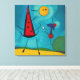 Ein skurriles, farbenfrohes abstraktes Gemälde, das einem roten, spitzen, wandenden Hut ähnelt, einer gelben Persönlichkeitssonne und einem blauen, fußenden Hund in einer Baseballkappe vor blauem Hintergrund und gelbem Boden., auf Leinwand gedruckt. Erhältlich in verschiedenen Größen.