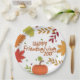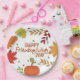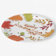 Machen Sie Ihren Erntedank mit Freunden noch mehr Besonderheit mit diesen schönen, modernen Friendsgiving-Papier-Tellern mit "Happy Friendsgiving"-Text in Orange Aquarell Schriftart, können Sie leicht mit dem Jahr, mit farbenfrohen Blätter und Blattlinie verziert anpassen.