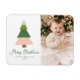 Moderner Weihnachtsmagnet mit einer Illustration eines Weihnachtsbaumes in Grün- und Rosatönen. "Frohe Weihnachten" wird in einem skurrilen grünen Skript mit Ihrem Namen und Jahr unten gezeigt. Personalisieren Sie den Magneten, indem Sie Ihr bevorzugtes vertikales Foto hinzufügen.