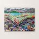 Dieses einzigartige Puzzle ist mit einem abstrakten Landschaftsmosaik in kräftigen Farben und Erdtönen dekoriert. Das originale Mosaik wurde aus winzigen Glasstücken, Kies und Fundstücken hergestellt. Original Mosaik © Michele Davies.