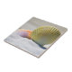 Ein Foto am Strand: farbenfrohe Muscheln im weißen Sand, lila, orange und gelb.