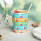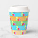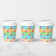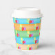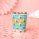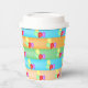 Farbenfrohe Papiertassen mit meinem Design aus gelben, grünen, lila und roten Ballons auf einem mehrfarbigen Hintergrund.