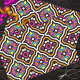 Modernes, auffälliges Gewebepapier mit einem nahtlosen Muster aus geometrischen Formen in Orange, Gelb, lila, Rosa, Schwarz und Weiß.