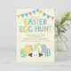 Unsere niedliche Ostereierjagd Kaninchen Ostern Party Einladung zeigt das niedlichste Hasen umgeben von Ostereiern Set auf einem hellgelben Hintergrund mit einem bunten Streifen zurück. Passen Sie sich mit Ihren persönlichen Daten an und Sie sind alle Set zu gehen.