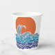 Farbenfrohe Ozeanwellen mit schönem Sonnenuntergang auf Papiertassen. Ideal für Feiern oder Party am Strand.