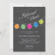 Moderne Hochzeitsessen-Probe-Einladung mit einem Nachthimmel mit lebhaften und farbenfrohen Hängeleuchten. Holzkohle schwarzer Hintergrund mit hellgrau, orange, grün, magentafarben, blau und limigrün.