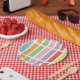 Geometrisches lineares, rechteckiges, gestreiftes Muster in den Farben Blau, Orange, Grün, Rosa, lila, Rot und Gelb.