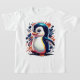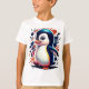 Ein spielerisches T - Shirt-Design, das eine bezaubernde Pinguin-Illustration mit skurrilen Details zeigt, gepaart mit charmanter, katzenthematischer Typografie zur Feier der felinen Zuneigung.