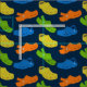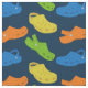 Setzen Sie Ihren besten Fuß nach vorne, wenn Sie Ihr nächstes Nähprojekt mit diesem lustigen gemusterten Stoff gestalten. Das Material zeigt Abbildungen von Plastikmoccasin Schuhen in Gelb, Kalkgrün, Orange und Hellblau vor einem marineblauen Hintergrund und ist somit perfekt für jeden, der einen entspannten lässigen Lebensstil bevorzugt.