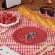 Auf diesen Party-Papier-Tellern sind ein leuchtend bunter Racehorse Kopf und Mist auf rotem Hintergrund zu sehen. PASSENDE Artikel in unserer Sammlung.