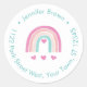 Dieses flexible Aufkleber-Design zeichnet sich durch einen zentralen Regenbogen und magentafarbene Herzen aus, umgeben von einem kreisförmigen Textrand. Hier für eine Rücksendeadresse angegeben, aber alle Textfelder sind flexibel auf Ihre Bedürfnisse, z.B. ein Dankeschön für Aufkleber.
