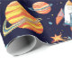 Lebhaftes, nahtloses Muster, das Raketen, Planeten und Sterne vor einem dunklen Hintergrund zeigt. Ideal für pädagogische, dekorative oder Kindermotive, die sich auf das Universum und den Weltraum beziehen.