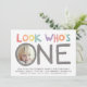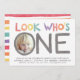 Rainbow 1. Geburtstag Einladungen mit "Look Who's One" farbenfrohe Wasserfarbe mit einem Foto und personalisiertem Text. Auf der Rückseite befindet sich ein niedliches Wasserfarbenmuster!