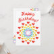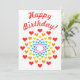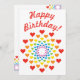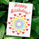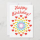Niedliche, bunte Geburtstagseinladung mit vielen Herzen in den Farben des Regenbogens, mit dem Text "Happy Birthday" darauf. Eine fröhliche und fröhliche Einladung für die geliebten.