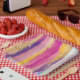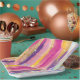 Papier-Teller mit abstraktem Hintergrund. Lebhafte Streifen in fett- und pastellfarbenen Farben. Pinks, Blues, Pfefferminzen und Gelbtöne kombiniert mit Imitaten funkelnd Glitzer in Gold überlagert.