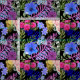 Farbenfrohe Retro Blumengestelle aus botanischem Blattwerk, schlichtes dunkles Blumendesign.