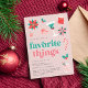 Freuen Sie sich auf ein Party im niedlichen Retrostil in Rosa und Rot, das mit klassischen Urlaubssorten in Rot und Grün vermischt wird. Ihre Lieblingssachen Party Details sind umgeben von Illustrationen von verpackten Feriengeschenke, poinsettia Blume, Heilige und Bonbons. Personalisieren Sie mit Ihren Party-Details, einschließlich Anweisungen für Ihre Gäste, wie viele Geschenke zu bringen und deren geschätzter Wert.