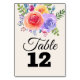 Hochzeitstisch, Zahlkarten mit einem fantasievollen Blumenstrauß mit Aquarellfarben-Rose. Stilvoll, skurril und kreativ. Ein Bündel von Rose in Rosa, lila und Gelb. Mit viel Grün und Blätter in Grün, Rosa, lila und Blau. Hintergrund ist eine cremefarbene Champagnerfarbe.