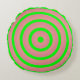 Individuell anpassbares, buntes Rundkissen mit kreisförmigem Design aus verschiedenen farbigen konzentrischen Kreisen auf der Vorder- und Rückseite des Kissens.