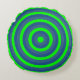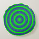Individuell anpassbares, buntes Rundkissen mit kreisförmigem Design aus verschiedenen farbigen konzentrischen Kreisen auf der Vorder- und Rückseite des Kissens.
