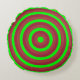 Individuell anpassbares, buntes Rundkissen mit kreisförmigem Design aus verschiedenen farbigen konzentrischen Kreisen auf der Vorder- und Rückseite des Kissens.