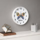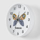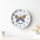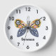 Ein lustiger dunkelblauer und senfgelber Schmetterling mit mehrfarbigen Kreisen auf einer weißen Uhr Gesicht mit leicht lesbaren großen schwarzen Zahlen. Klicken Sie auf Personalisieren, um einen Namen hinzuzufügen.