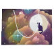 Sonnenuntergang färbt die surreal aussehenden Wolken im Himmel in Blau, lila, Rosa und Gelb in dieser niedlichen Weltraum-Illustration. Eine schwarze Katze sitzt auf dem Halbmond und blickt mit Faszination auf die Sterne hinaus. Wird sie greifen und versuchen, einen zu fassen?