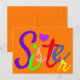 Das ist eine lustige, hellorangefarbene Postkarte, auf der "Schwester" in coolen, farbigen Buchstaben steht! Perfekt, um eine zu deiner Schwester zu schicken und ihr zu zeigen, dass du sie sehr Liebe hast!