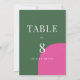 Dieses kühne und farbenfrohe Zeichen der Hochzeitsfeier wird Ihre wunderschöne Hochzeitsdekoration noch verstärken. Dieses Tischnummer-Zeichen verfügt über eine fett und hell smaragdgrüne und rosa Farbpalette mit leicht lesbaren Schriftzeichen. Dieses Design passt zu den farbenfrohen farbigen Block Hochzeitssuite in meinem Zazzle-Shop. Dieses Design ist vollständig an Ihre Informationen und Farben angepasst, mit beidseitigem Druck.