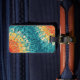 Abstrakte Retroillustrierung der Sonnenflare in Blau, Türkis, Beige, Orange, Gelb und Rot auf dunkelblauem Hintergrund für alle, die abstraktes Design mögen.