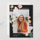 Farbenfrohe helle Sommerblumenarrangements und Grünanlagen, Ankündigung und Einladung des Abschlusses. Kartenfeatures, schwarze Hintergrundfarbe, gerahmtes Foto an der Vorderseite des Single mit 3 zusätzlichen Foto-Leerzeichen auf der Rückseite.