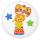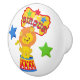 Dieser niedliche Knopf zeigt einen bezaubernden Löwen, der auf seinem Schaustand vor einem grünen, roten und blauen Zirkuszeichen sitzt. An der Seite des Löwen ist ein blauer Stern und ein grüner Stern. Ideal für jedes Kinderzimmer.