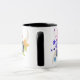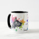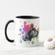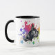 Ein Aquarellbild eines schönen schwarzen Großen Dans entsteht aus einer Collage von bunten Sternen auf dieser Tasse. Die Sterne sind in Rosa, Blau, aquamarin, Gelb und Grün gehalten. Das Bild wird auf zwei Seiten gedruckt, der Text ist in schwarz am mittleren Ende der Bilder. Perfekt für jeden, der sein Herz an einen Dänen verloren hat!