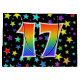 Dieses aufregende, lustige und lebendige Geschenktütendesign zeichnet sich durch viele farbenfrohe Sternformen aus, zusammen mit der Zahl "17" mit einem farbenfrohen Regenbogen-inspirierten Farbverlaufsmuster auf schwarzem Hintergrund. Eine Geschenktasche wie diese könnte vielleicht eine lustige und fröhliche Art sein, Geschenke oder Geschenke für jemanden zum siebzehnten Geburtstag zu verpacken, oder vielleicht für ein Paar zum siebzehnten Hochzeitstag, oder ein anderes 17. Ereignis. [~Z0000347]