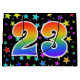Dieses aufregende, lustige und lebendige Geschenktütendesign zeichnet sich durch ein farbenfrohes Sternfeld-inspiriert Muster aus, zusammen mit der Zahl "23" mit einem bunten Regenbogenspektrum wie Farbverlaufsmuster auf schwarzem Hintergrund. Eine Geschenktasche wie diese kann eine lustige, glückliche Art sein, Geschenke zu verpacken oder Geschenke für jemanden zu geben dreiundzwanzig Geburtstag, oder vielleicht für ein Paar dreiundzwanzig Hochzeitstag, oder irgendein anderes 23. Ereignis. [~Z0000347]