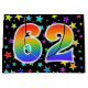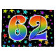 Dieses aufregende, lustige und lebendige Geschenktütendesign zeichnet sich durch ein farbenfrohes Sternmuster aus, zusammen mit der Zahl "62" mit einem farbenfrohen Regenbogenspektrum wie Farbverlaufsmuster auf schwarzem Hintergrund. Eine Geschenktasche wie diese kann eine lustige, glückliche Art sein, Geschenke zu verpacken oder Geschenke zu geben, für jemandes zweiundsechzigsten Geburtstag, oder vielleicht für ein Paar zweiundsechzig Hochzeitstag, oder ein anderes 62. Ereignis. [~Z0000347]