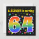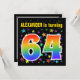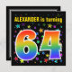 Dieses lustige, lebendige und aufregende Geburtstagsfeier-Einladungs-Design zeichnet sich durch ein farbenprächtiges, inspiriertes Sternenmuster aus, zusammen mit der Zahl "64" mit einem farbenfrohen Regenbogen-inspiriert Spektrum oder Gradientenmuster. Der Name auf der Vorderseite kann personalisiert sein. Auf der Rückseite finden Sie personalisierte Informationen zum Party. Geburtstagsfeierlichkeiten wie diese werden vielleicht geschickt, um Gäste zu einer Geburtstagsparty einzuladen, die zum Feiern des vierundsechzigsten Geburtstages von jemandem veranstaltet wird. [~Z0000349]