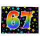 Dieses aufregende, lustige und lebendige Geschenktütendesign zeichnet sich durch ein farbenfrohes Muster von Sternen aus, zusammen mit der Zahl "67" mit einem farbenfrohen Regenbogenspektrum wie Farbverlaufsmuster auf schwarzem Hintergrund. Eine Geschenktasche wie diese könnte eine lustige Art sein, Geschenke oder Geschenke für jemanden zu verpacken, der zum siebzigsten Geburtstag, oder vielleicht für ein Paar zum siebzigsten Hochzeitstag, oder für ein anderes 67. Ereignis. [~Z0000347]