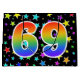 Dieses aufregende, lustige und lebendige Geschenktütendesign zeichnet sich durch ein farbenfrohes Sternenmuster aus, zusammen mit der Zahl "69" mit einem farbenfrohen Regenbogen-inspirierten Farbverlauf auf schwarzem Hintergrund. Eine Geschenktasche wie diese könnte vielleicht eine lustige und glückliche Art sein, Geschenke oder Geschenke für jemanden zu verpacken, der zum neunundsechzigsten Geburtstag, oder vielleicht für ein Paar zum neunundsechzigsten Hochzeitstag, oder für ein anderes 69. Ereignis. [~Z0000347]
