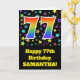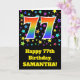 Die Vorderseite dieses aufregenden, lustigen und lebendigen Geburtstagskarten-Designs zeichnet sich durch ein farbenfrohes Muster von Sternformen aus, zusammen mit der Zahl "77" mit einem farbigen Regenbogenspektrum wie Farbverlaufsmuster auf schwarzem Hintergrund. Auf der Vorderseite befindet sich auch eine Geburtstags-Grußbotschaft, die auch einen benutzerdefinierten Empfängernamen enthält. Im Inneren befindet sich eine benutzerdefinierte Geburtstagsgrüßbotschaft, oder man könnte sie löschen und leer verlassen werden, wenn eine Nachricht von Hand geschrieben werden soll. Eine individuell anpassbare Geburtstagskarte wie diese könnte eine lustige Art sein, Geburtstagswünsche an jemanden zu senden, der seinen siebzigsten Geburtstag feiert. [~Z0000348]