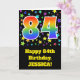 Die Vorderseite dieses aufregenden, lustigen und lebendigen Geburtstagskarten-Designs zeigt zahlreiche farbenfrohe Sternformen, zusammen mit der Zahl "84" mit einem farbenfrohen Regenbogen-inspirierten Farbverlaufsmuster auf schwarzem Hintergrund. Auf der Vorderseite befindet sich auch eine Geburtstags-Grußnachricht, einschließlich eines benutzerdefinierten Empfängernamens. Im Inneren befindet sich eine individuell anpassbare Geburtstags-Grußnachricht, oder vielleicht kann gelöscht und links werden, wenn eine Nachricht von Hand geschrieben werden soll. Eine personalisierte Geburtstagskarte wie diese könnte eine lustige Art sein, jemandes vierundachtzigsten Geburtstag anzuerkennen. [~Z0000348]