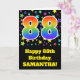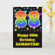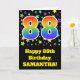 Die Vorderseite dieses aufregenden, lustigen und lebendigen Geburtstagskarten-Designs zeichnet sich durch ein farbenfrohes Muster von Sternformen aus, zusammen mit der Zahl "88" mit einem farbigen Regenbogenspektrum wie Farbverlaufsmuster auf schwarzem Hintergrund. Auf der Vorderseite befindet sich auch eine Geburtstagsgrüßbotschaft mit einem personalisierten Empfängernamen. Im Inneren befindet sich eine individuell angepasste Geburtstagsgrüßbotschaft, oder man könnte sie löschen und leer verlassen werden, wenn eine Nachricht von Hand geschrieben werden soll. Eine solche Geburtstagskarte könnte eine lustige Art sein, Geburtstagswünsche an jemanden zu senden, der gerade seinen achtundachtzigsten Geburtstag feiert. [~Z0000348]