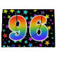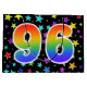 Dieses aufregende, lustige und lebendige Geschenktütendesign zeichnet sich durch viele farbenfrohe Sternformen aus, zusammen mit der Zahl "96" mit einem farbenfrohen Regenbogen-inspirierten Farbverlaufsmuster auf schwarzem Hintergrund. Eine Geschenktasche wie diese könnte vielleicht eine lustige Art sein, Geschenke oder Geschenke für jemanden zu packen, der zum sechsundneunzigsten Geburtstag, oder vielleicht für ein Paar zum sechsundneunzigsten Hochzeitstag, oder für ein anderes 96. Ereignis. [~Z0000347]