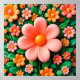 Farbenfrohe, stilisierte Blume Set vor einem reichen grünen Hintergrund. In der Mitte befindet sich eine große, weiche rosa Blume mit abgerundeten Blättern und einem orangefarbenen Zentrum. In der Umgebung befinden sich kleine Blume in verschiedenen Orange-, Rosa- und Gelbtönen, die eine lebhafte und fröhliche Komposition schaffen
