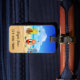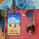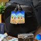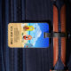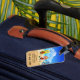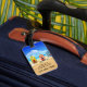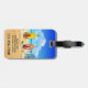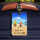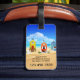 Gepäckmarke mit einer fröhlichen Strandszene mit bunten Häusern und einer einladenden Katze :-) Herrlich für Strand- und Katzenliebhaber.