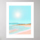 Ein Retro-Gemälde an der Küste im Sommer, in dem die Sonne, die Meereswellen, der Sand am Strand und die Berge strahlend und fröhlich sind, darunter blaue Farbtöne für den Ozean, warme Gelbtöne für die Sonne und erdige Farbtöne für den Sand, die eine lebhafte und einladende Atmosphäre schaffen, die jedem Dekor ein buntes Vintages Urlaubsgefühl verleiht. Der Geist der Ruhe, der mit dem Verweilen am Strand während der Sommersaison verbunden ist.